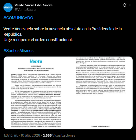 El 10 de abril, el partido Vente Venezuela liderado por María Corina Machado difundió un comunicado a través de su cuenta oficial en la red social X y sus cuentas asociadas regionales, en el que se hacía referencia a una “ausencia absoluta en la presidencia de la República” y se planteaba la necesidad de restituir el orden constitucional mediante la convocatoria de un nuevo proceso electoral. Al tratarse de un pronunciamiento institucional, el documento refleja la posición política de su liderazgo.